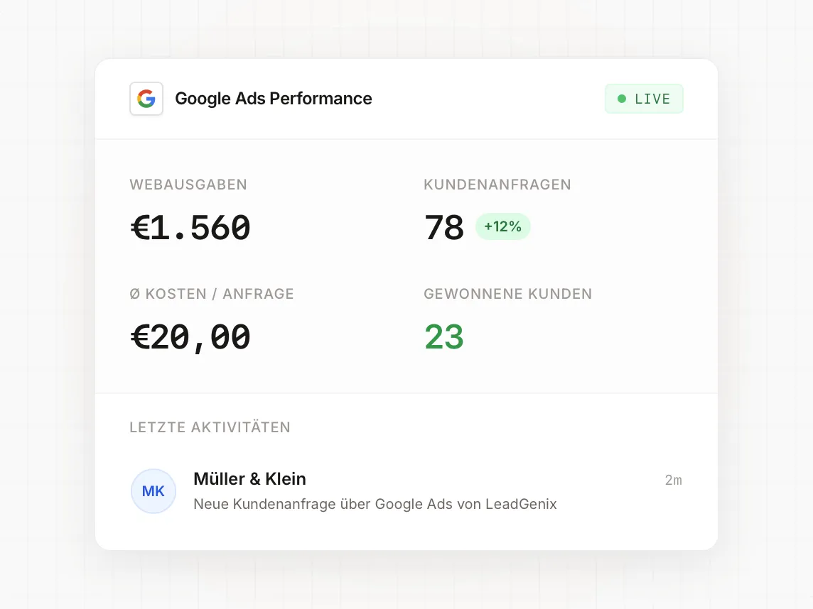 Sie wissen immer, wofür Sie bezahlen. Wir arbeiten mit klaren KPIs, regelmäßigen Reports und zeigen Ihnen schwarz auf weiß, was Ihr Marketing bringt. Keine leeren Versprechungen, sondern harte Fakten.