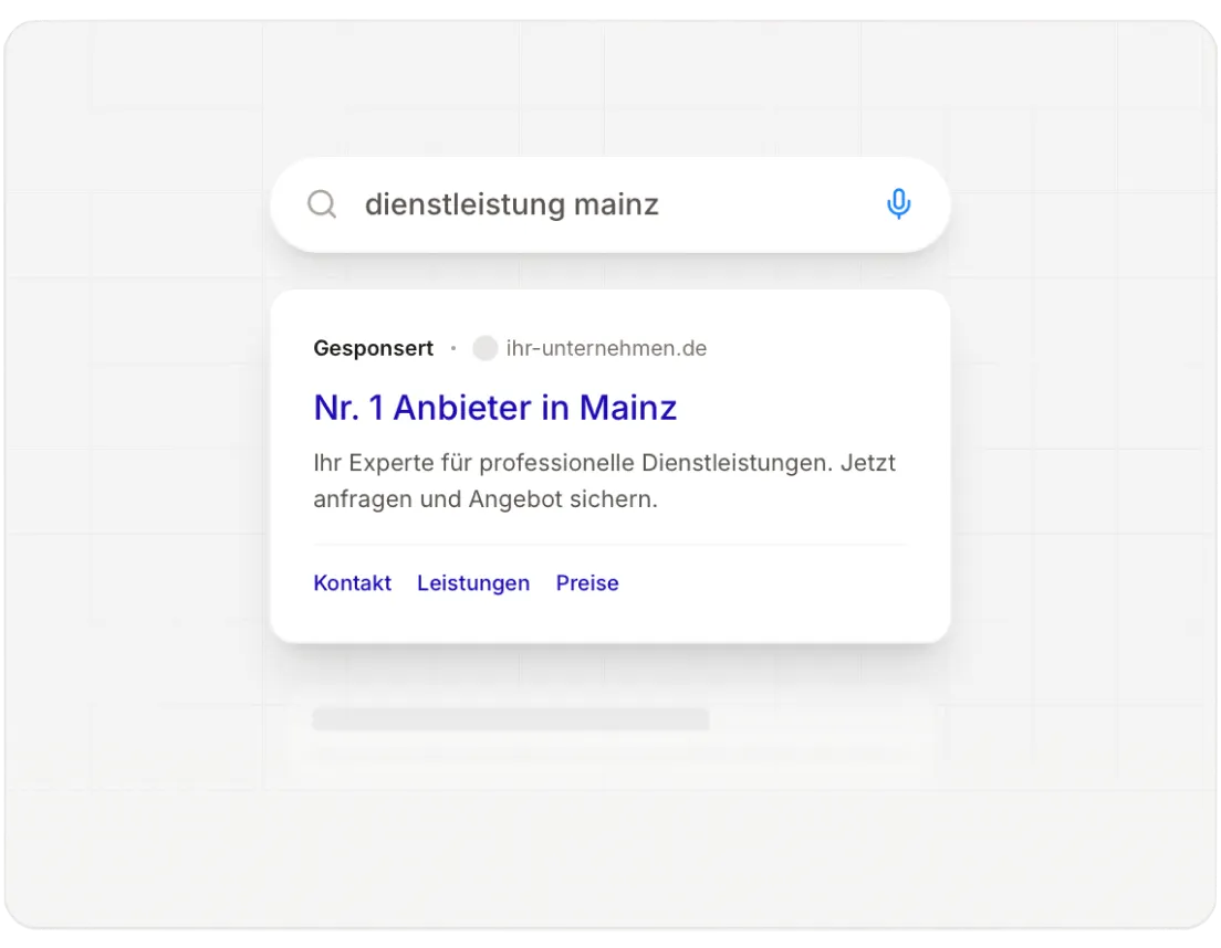 Mit Google Ads platzieren wir Ihr Unternehmen in Mainz über allen organischen Suchergebnissen. Ihre potenziellen Kunden suchen bereits aktiv nach Ihren Leistungen – wir sorgen dafür, dass sie Sie finden. Durch die gezielte Ausrichtung auf relevante Suchanfragen erreichen Sie nur Interessenten, die wirklich an Ihrem Angebot interessiert sind.